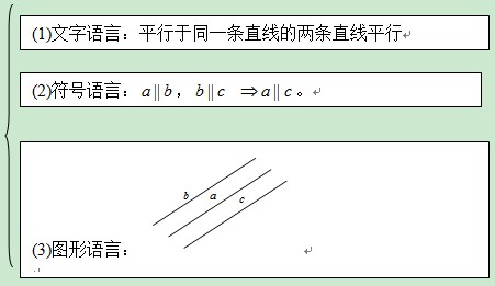 例如:1. 立体几何教材§2.1.2 空间中直线与直线之间的位置关系中的公里4 :平行于同一条直线的两条直线平行.分别用文字语言、符号语言、图形语言表达如下: